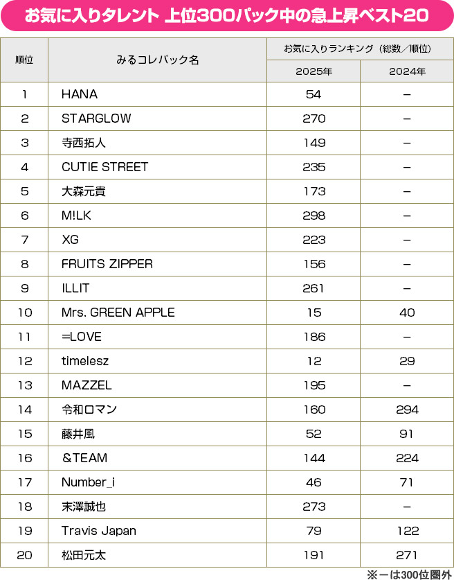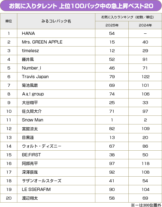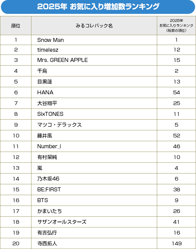 まずは「お気に入り増加数ランキングベスト20」。24年12月~25年11月までの1年間に「みるコレ」の“タレントパック”で新たにお気に入り登録したユーザーが多いタレントを順に並べた、まさに今年の注目度が分かるランキングである。