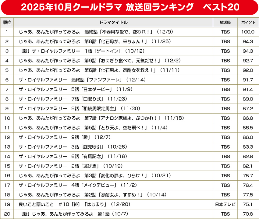 「ザ・ロイヤルファミリー」が「じゃあ、あんたが作ってみろよ」をわずかに抑えてトップに立った。3位以下のドラマとは大きく差が開いており、この2作が秋ドラマの2トップだったことに議論の余地はないだろう。