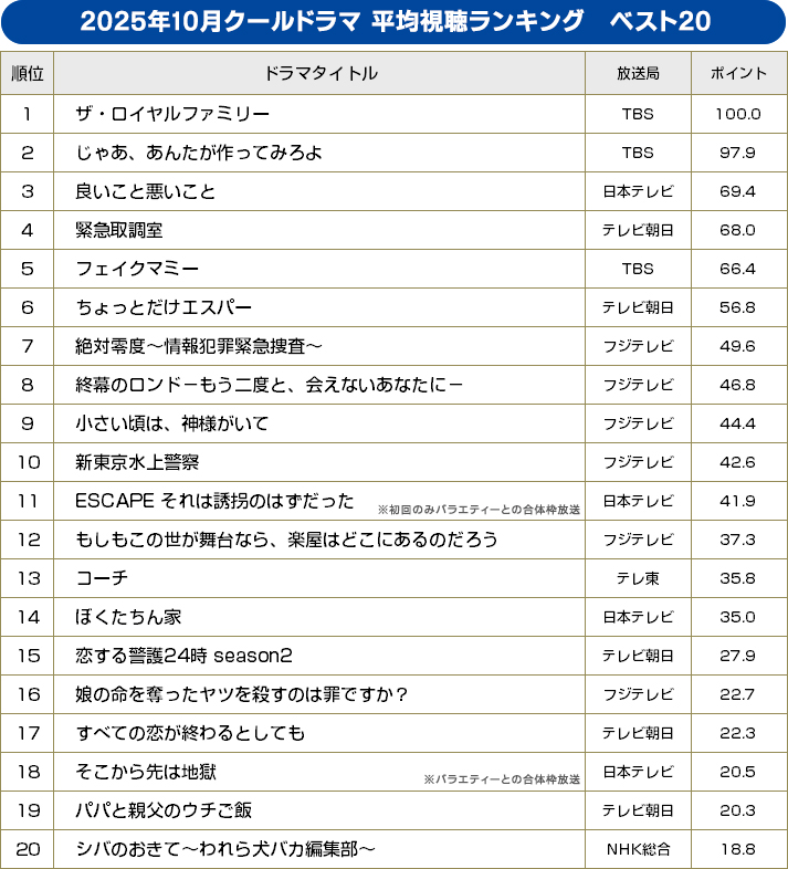 2025年秋ドラマ/平均視聴ランキング ベスト20【BRAND NEW TV WORLD!!】