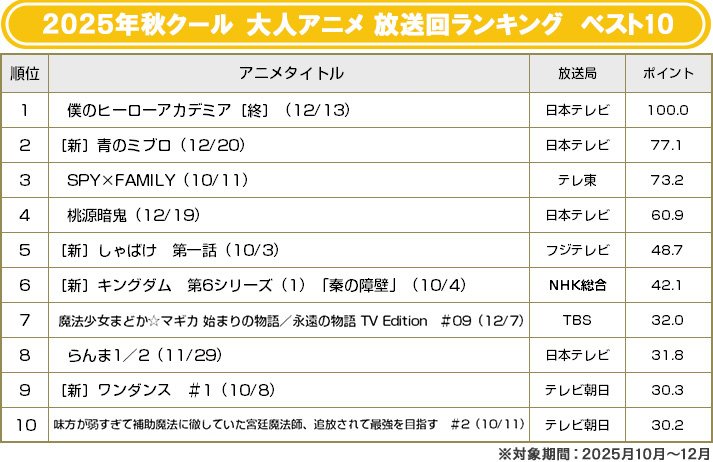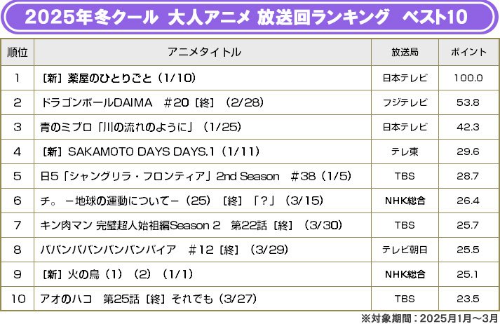 2位「ドラゴンボールDAIMA」(フジテレビほか)はじめ、3位「青のミブロ」(日本テレビ/読売テレビほか)、5位「シャングリラ・フロンティア」(TBSほか)、6位「チ。-地球の運動について-」(NHK総合)、7位「キン肉マン完璧超人始祖編」(TBSほか)、10位「アオのハコ」(TBS系)と、前クールからの継続組がランキングを席巻。新スタート組では、ともに実写映画化も話題となった「SAKAMOTO DAYS」(テレ東ほか)と「ババンババンバンバンパイア」(テレビ朝日ほか)がランクインしている。