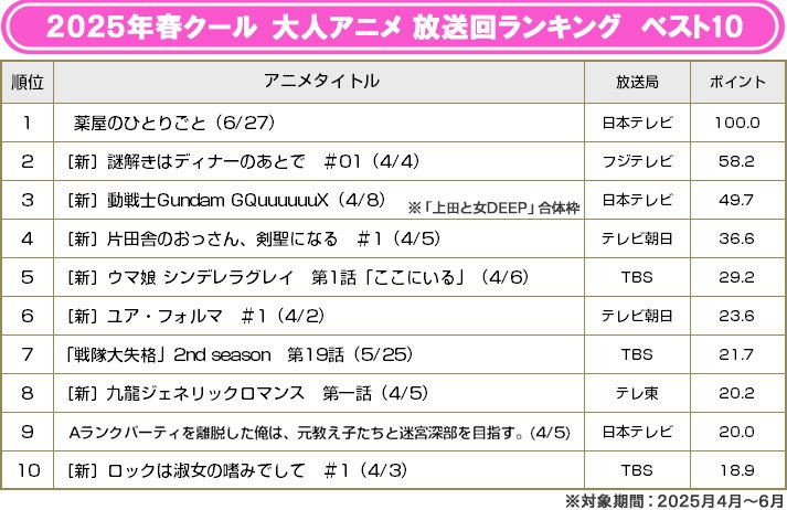 初回が最高ポイントを獲得している作品が多いのがミソだ。前クール(冬クール)ではベスト10入りを果たせなかった「Aランクパーティを離脱した俺は、元教え子たちと迷宮深部を目指す。」は、ポイントを上げて9位に食い込んだ(ちなみに「機動戦士Gundam GQuuuuuuX」は、直前放送の「上田と女がDEEPに吠える夜」との合算ポイント。合算でなかったとしたら、ポイントは果たして上がったろうか、下がったろうか)。