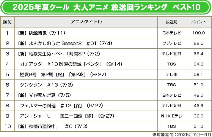 「劇場版『鬼滅の刃』無限城編 第一章 猗窩座再来」が7月18日に公開され、爆発的なヒットを記録した25年の夏。トップに立ったのは日本テレビ「FRIDAY ANIME NIGHT」枠の「桃源暗鬼」。イケメンキャラクターが多いことから女性人気も高く、続編も決定していて、納得の第1位だ。それに続き、「よふかしのうた」(フジテレビほか)、「怪獣8号」(テレ東ほか)、「ダンダダン」(TBS/毎日放送ほか)など、注目アニメの第2期が続々放送され話題を呼んだ。ダーク・ホラーテイストな作品が上位に食い込んだクールと言える。