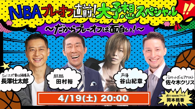 WOWOWではプレーオフ開幕に先がけて、4月19日午後8時から「NBAプレーオフ直前!大予想スペシャル!~だからプレーオフは面白い!~」をWOWOW公式YouTube、WOWOWオンデマンドで無料ライブ配信。NBAをこよなく愛するゲストとして、麒麟・田村裕、声優の谷山紀章、Soスポ! 責任編集長の長澤壮太郎、バスケットボールアナリストの佐々木クリスが出演する。出演にあたり、田村、長澤、佐々木からコメントが届いた。
