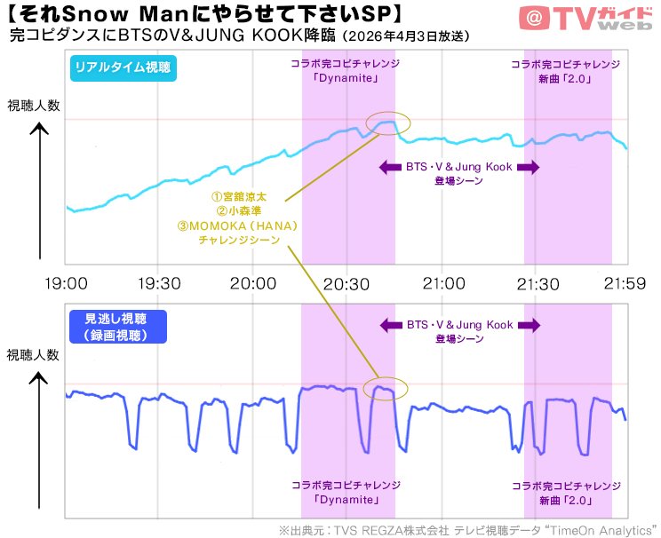 | 1 | それSnow Manにやらせて下さいSP 完コピダンスにBTSのV&JUNG KOOK降臨(4/3) | TBS | 100.0 |